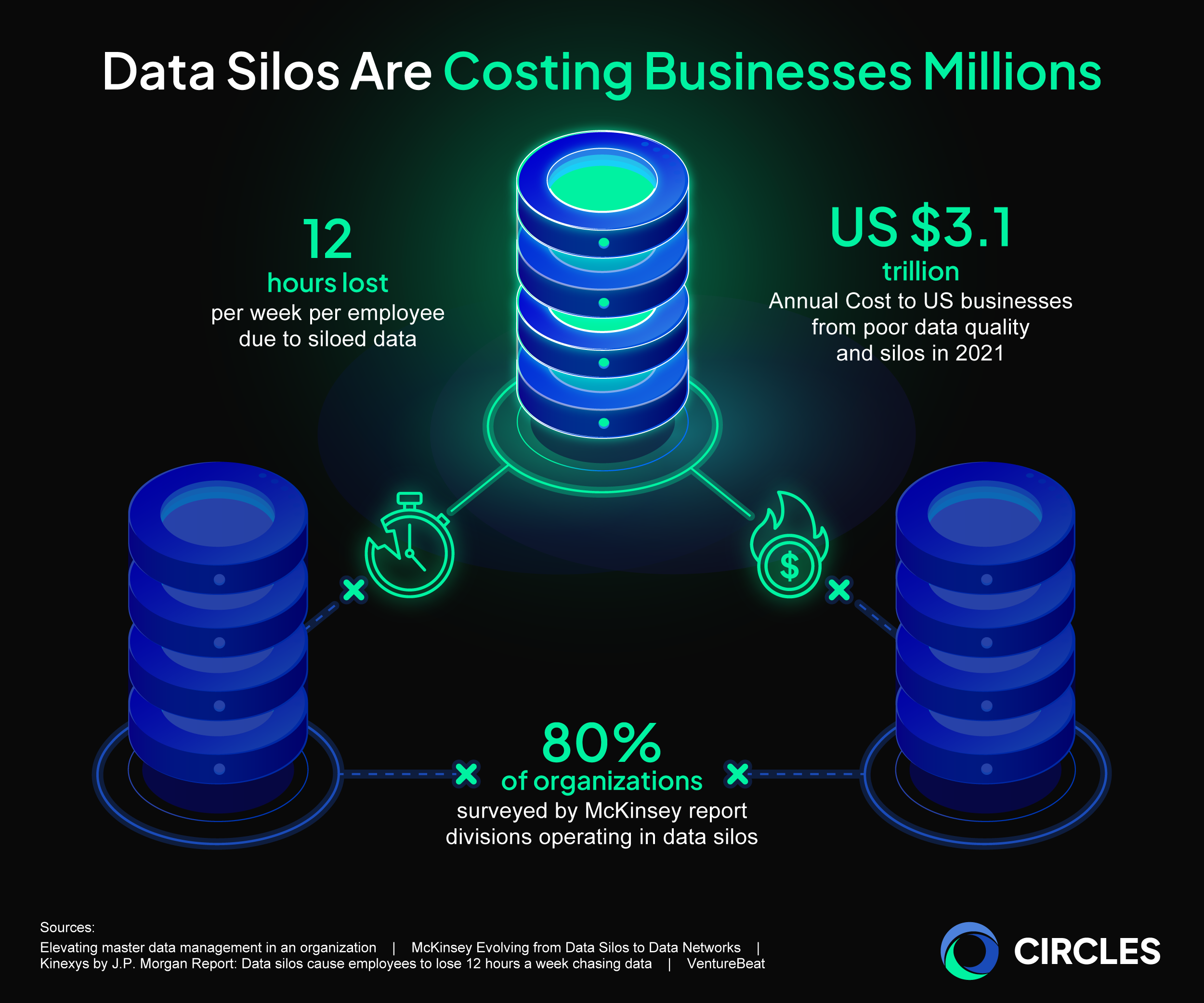 Meanwhile, data silos also cost employees a lot of time, as workers can lose up to 12 hours a week searching for information trapped in silos. Part of why this happens is because different departments and different companies store data using their own formats without making it easy to use or access for users outside their domain.