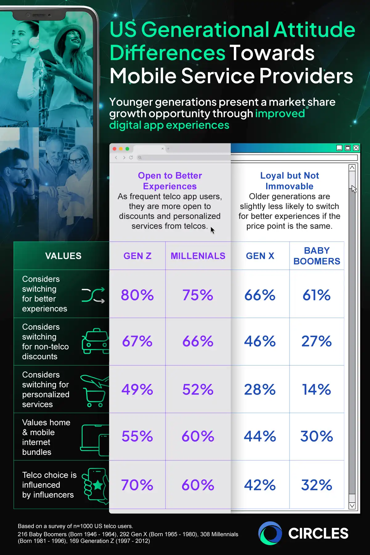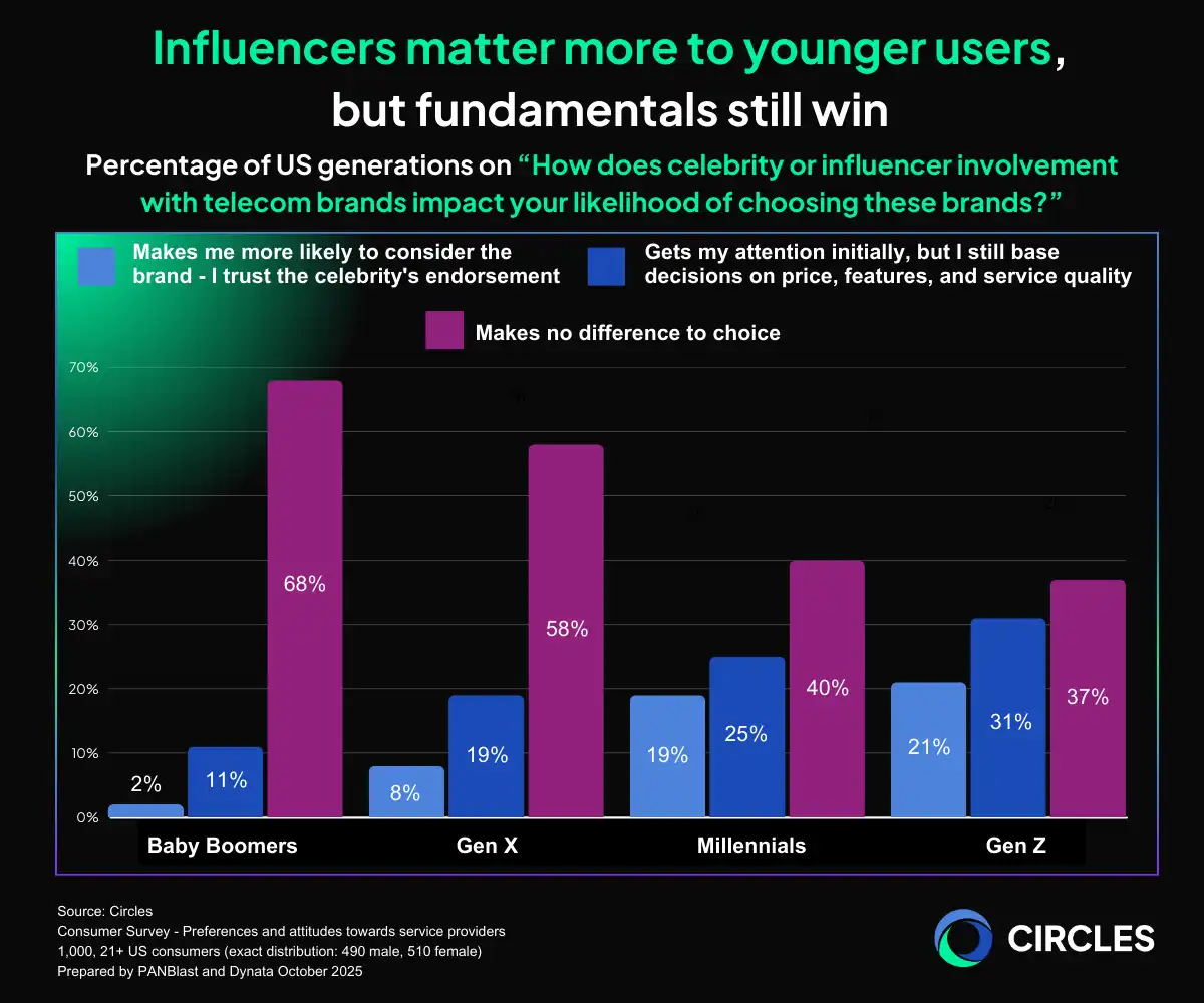 What this means for telcos is that influencer and celebrity endorsements can help with top-of-funnel marketing awareness, but these still need to link back to real product performance and advantages. For the older generations, trust, service reliability, and value-for-money messaging are the way to go.